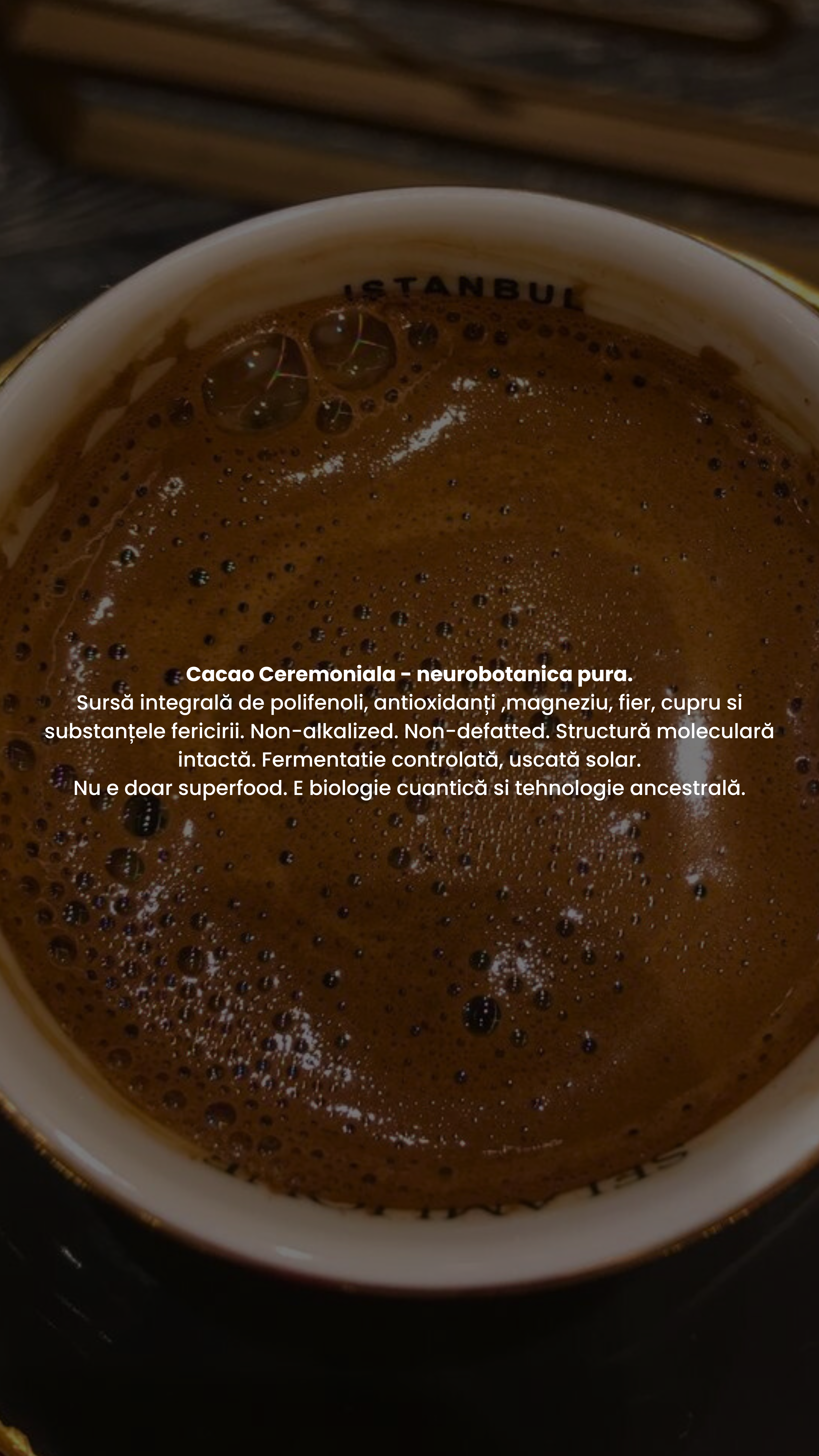 Non-alkalized. Non-defatted. Structură moleculară intactă. Cultivată în strat vulcanic activ, fermentație controlată, uscată solar.